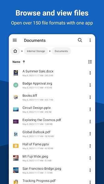 File Viewer for Android is an easy-to-use file viewer and file manager that can open over 150 file types, including PDFs, Office documents (.doc, .docx, .ppt, .pptx, .xls, .xlsx), and multimedia files.