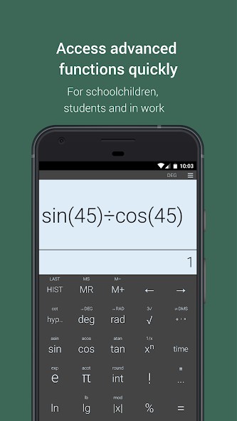 - radians, degrees calculations with DMS displaying mode (degree-minute-second)