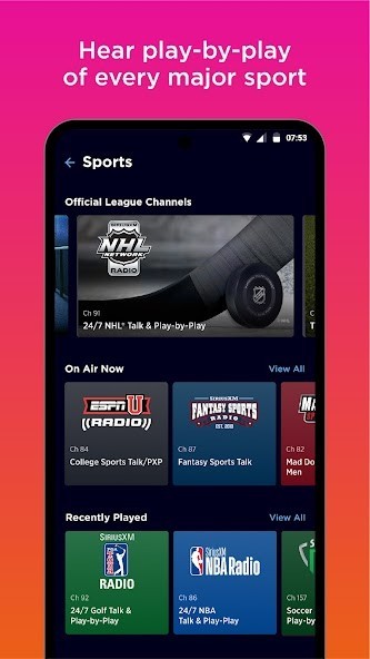 - NFL, MLB®, NBA, NHL®, and NCAA® play-by-play, NASCAR®, plus the biggest names in sports talk